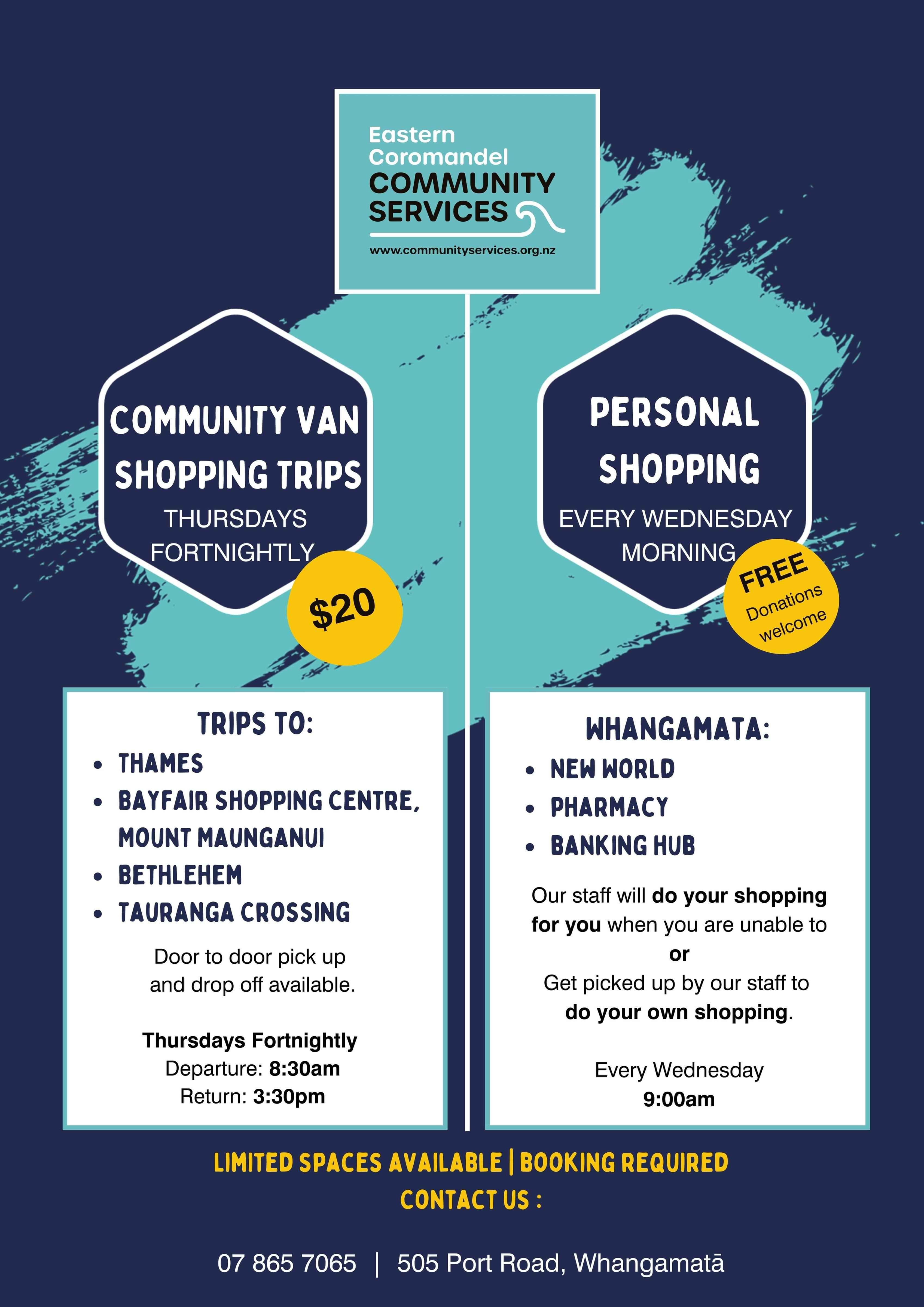 We also run fortnightly van trips for out of town shopping. See poster or click here for more Community Transport information